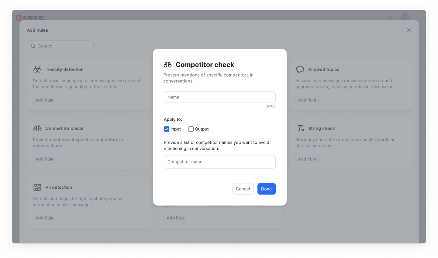 Competitor Check allows users to define one or more entities that are not allowed to be discussed semantically. The check can be relevant both for inputs and outputs.