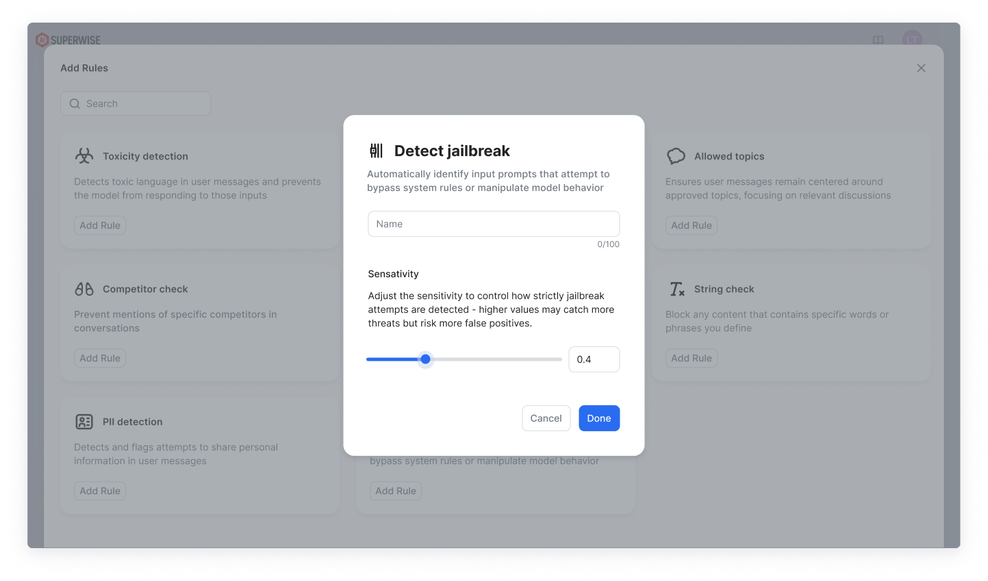 Jailbreak detection is based on the jailbreak-classifier open source model. It allows users to apply a detection mechanism to prevent attempts to bypass the model’s built-in boundaries and system prompts to generate unwanted or unexpected interactions. The higher the sensitivity parameter is configured, the greater the chance of this guardrail being activated and detecting violations.