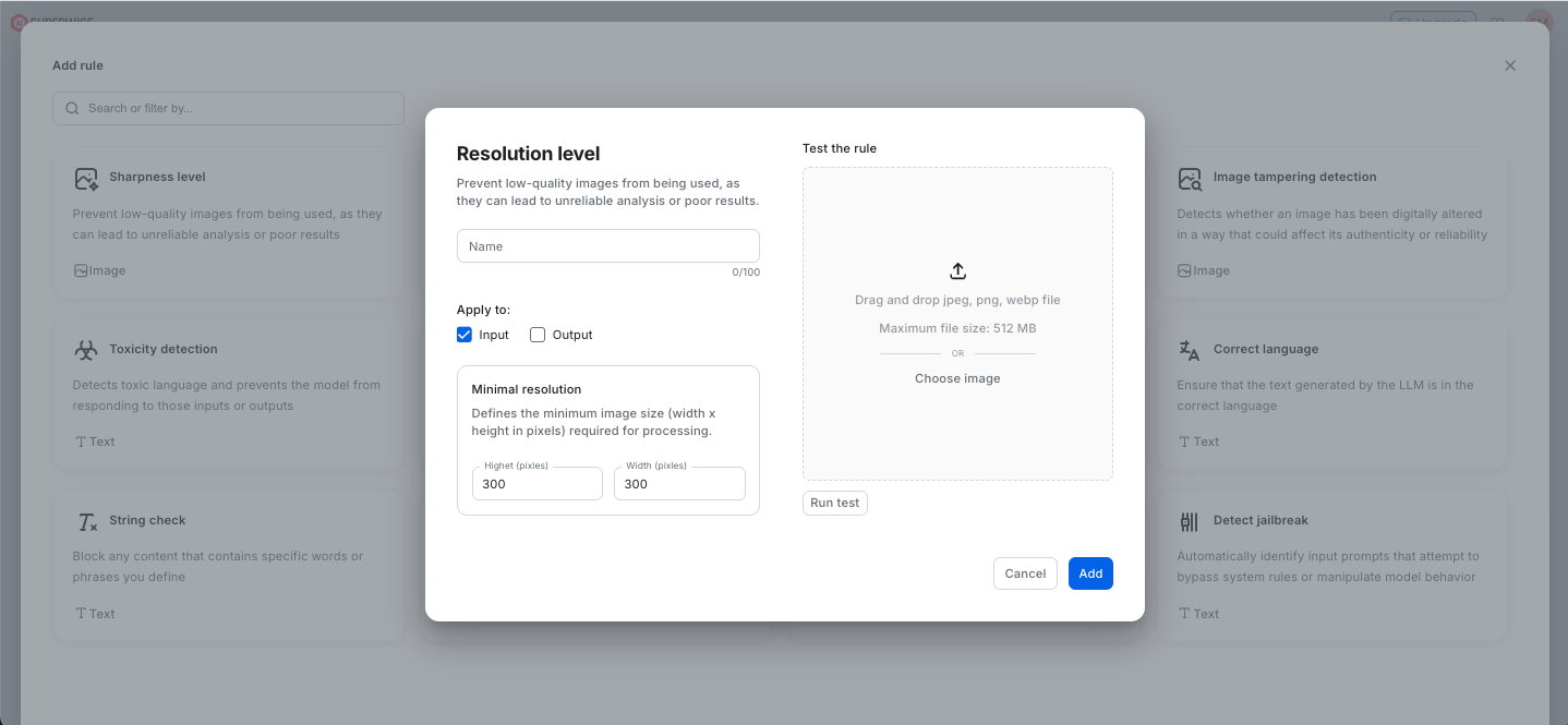 The Image Resolution Check in SUPERWISE® ensures that only high-quality visual data enters or leaves your AI pipeline, preventing the unreliable analysis and poor downstream results often caused by low-fidelity images. By allowing users to define strict minimum height and width requirements (in pixels), this check acts as a quality gate that automatically filters out blurry, pixelated, or overly compressed files that could degrade model performance. Whether applied to user-generated input to protect model inference or to output to maintain brand and quality standards for generated content, this rule provides granular control over visual assets. To ensure precision, the interface includes a built-in testing environment where users can upload sample JPEG, PNG, or Webp files to validate their resolution settings in real-time before they are added to a wider guardrail configuration. This proactive approach to data integrity minimizes compute waste on low-quality processing and guarantees that your vision-based agents operate with the highest possible clarity and accuracy.