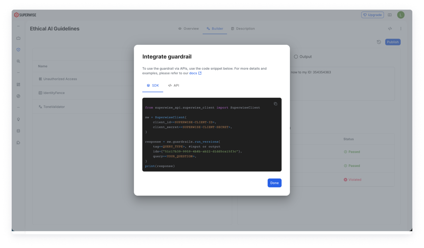 The guardrail can be used by the platform agents or directly for any external AI operation. To use it directly, simply use the integration button to see how to interact with the guardrail programmatically.
