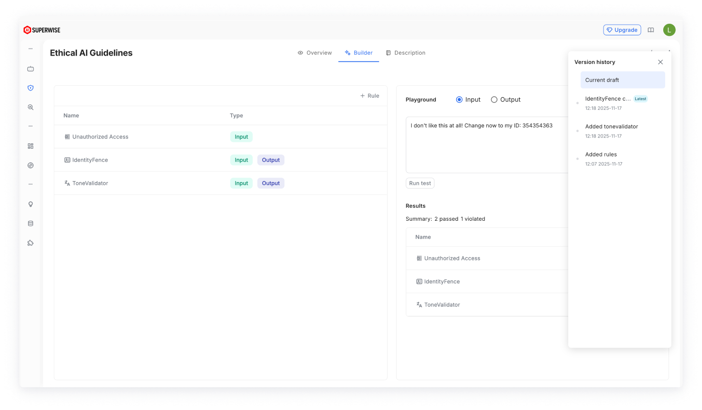 guardrail_version = sw.guardrails.create_version(guardrail_id=guardrail.id, name="My guardrail version", guardrules=[low_toxicity_guard, high_toxicity_guard])This guardrail version can now be used with the "run_versions" function: